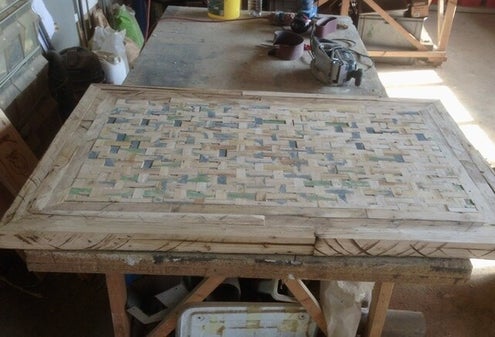 zodra ik uit gepuzzeld was heb ik de strookjes in een dikke laag lijm op een reststuk multiplex gelijmd en elk stukje vast gespijkerd.
